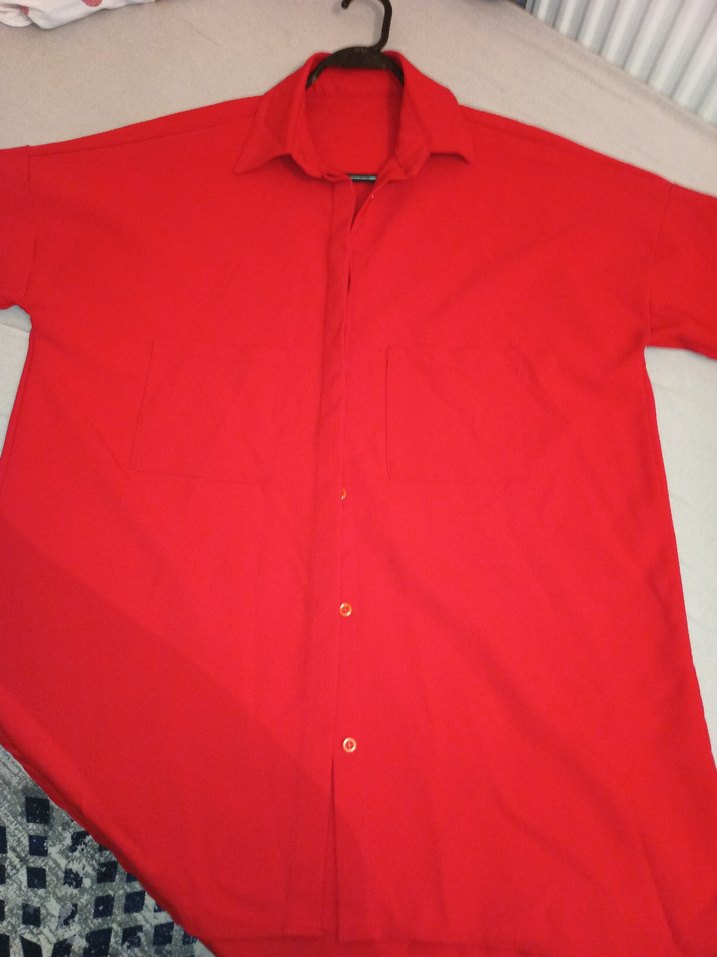 Düğmeli, uzun kollu kırmızı kadın gömlek , notlu yaka ve bol kesim. Günlük rahat sokak stili. kumaşı tok kalın bir kumaş 42 44 bedene 46 bedene kadar olur