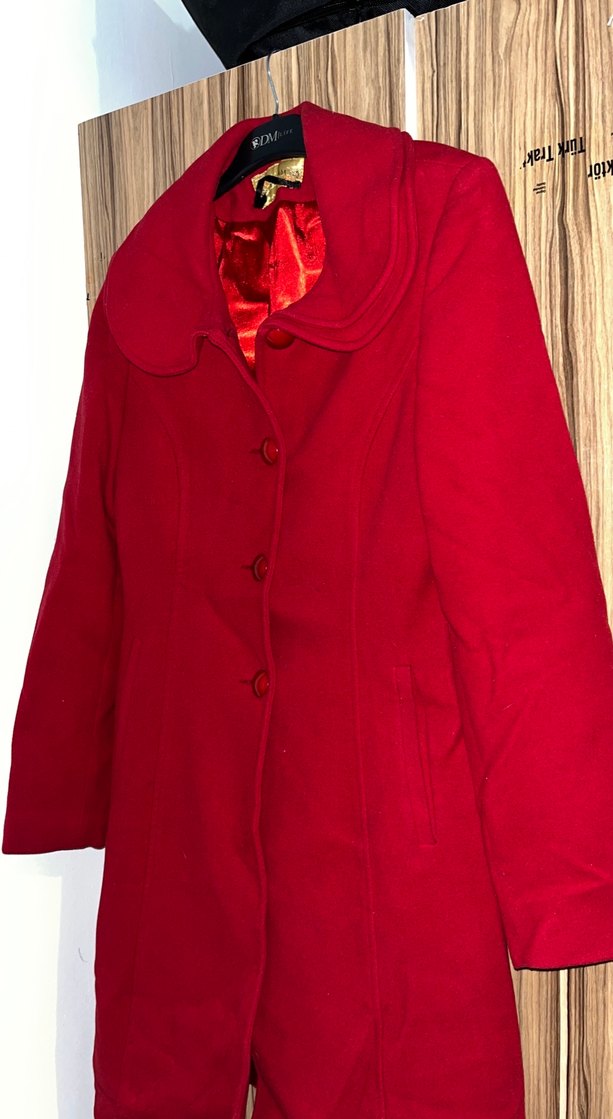 Kırmızı düğmeli kadın kaban, yuvarlak yakalı ve içi yumuşak astarlı. Uzun kollu ve yan ceplidir.