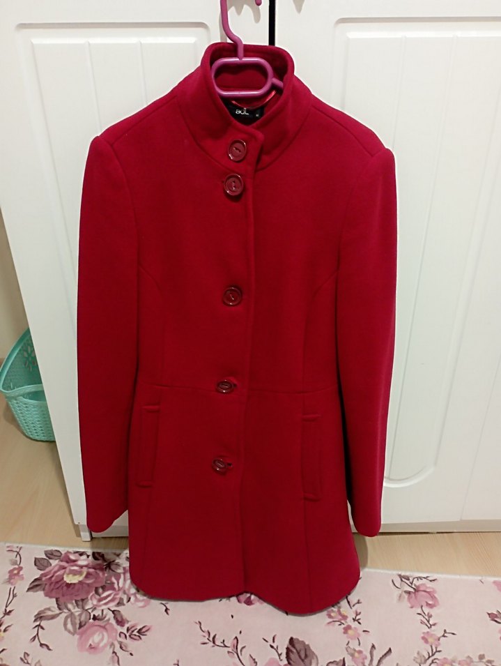 Düğmeli kapama ve yan cepleri olan kırmızı kadın kaban. Yüksek yakalı ve vücuda oturan kesimiyle şık bir görünüm sunar.