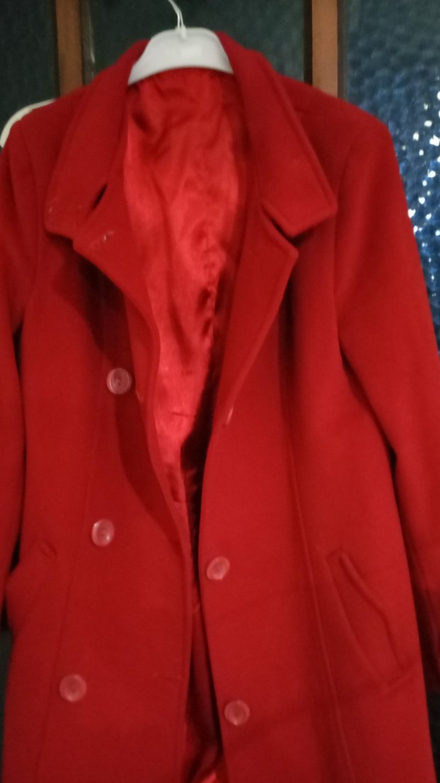 Kırmızı renkli kadın kaban, düğmeli ve iç kısmı yumuşak astarlı. Klasik yakalı ve yan cepli, sıcak tutar.