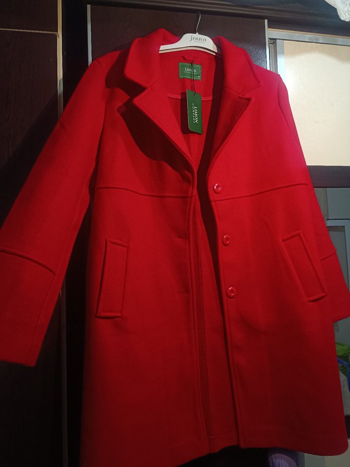Kırmızı renkli kadın kaban, uzun kollu ve düğmeli ön kapama özelliklerine sahiptir. Önünde kullanışlı cepler bulunur ve klasik yaka tasarımıyla dikkat çeker. Hiç giyilmedi hallen yep yeni