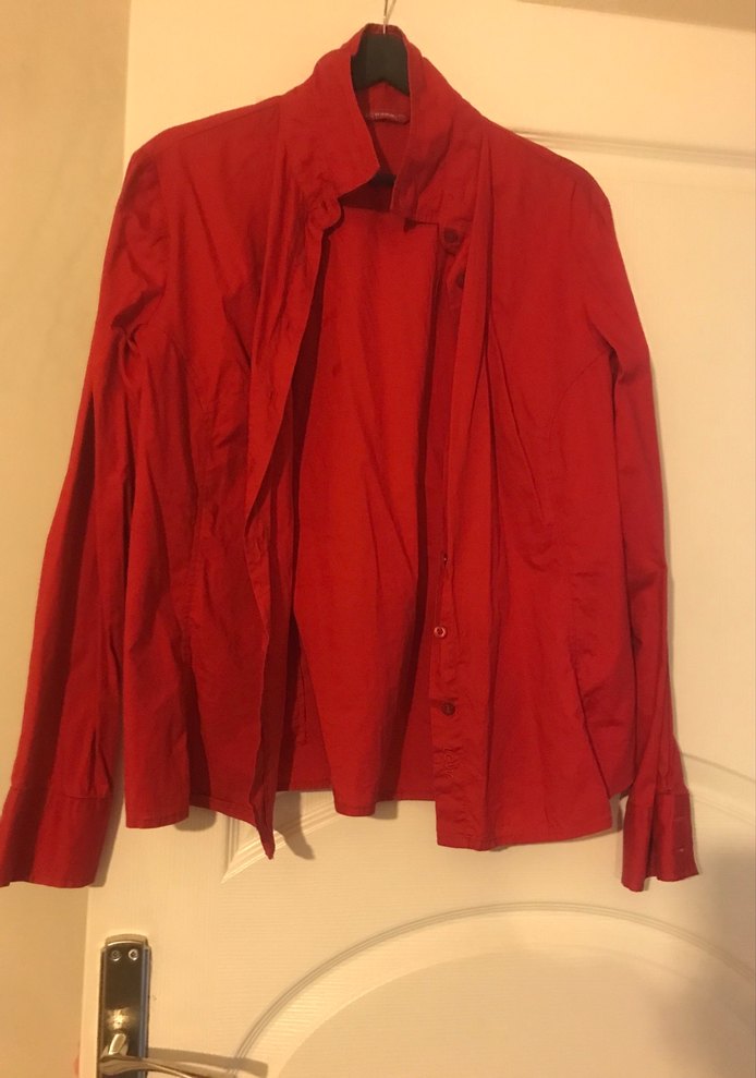 Kırmızı keten kumaştan, uzun kollu ve düğmeli, yakası çentikli, bol kesim kadın gömleği. Ofis kullanımı için uygun, parlak görünümde. Üç gömlek fiyatıdır