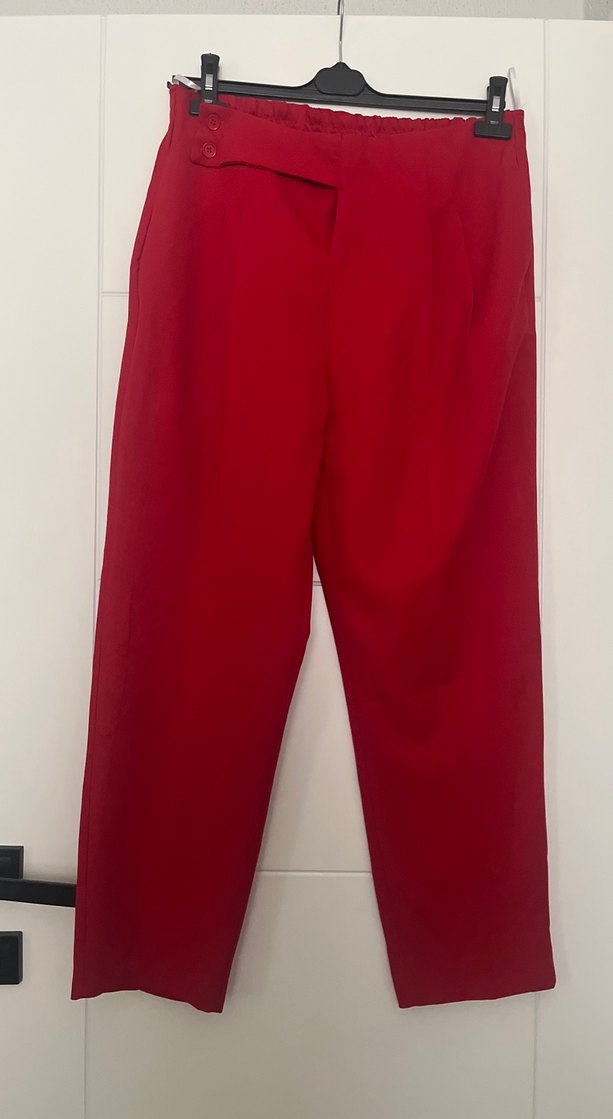 Kırmızı düğmeli kadın kumaş pantolon, midi boy ve regular fit. İpeksi kumaştan, parlak görünümlü, ofis için uygun minimalist tarzda.
