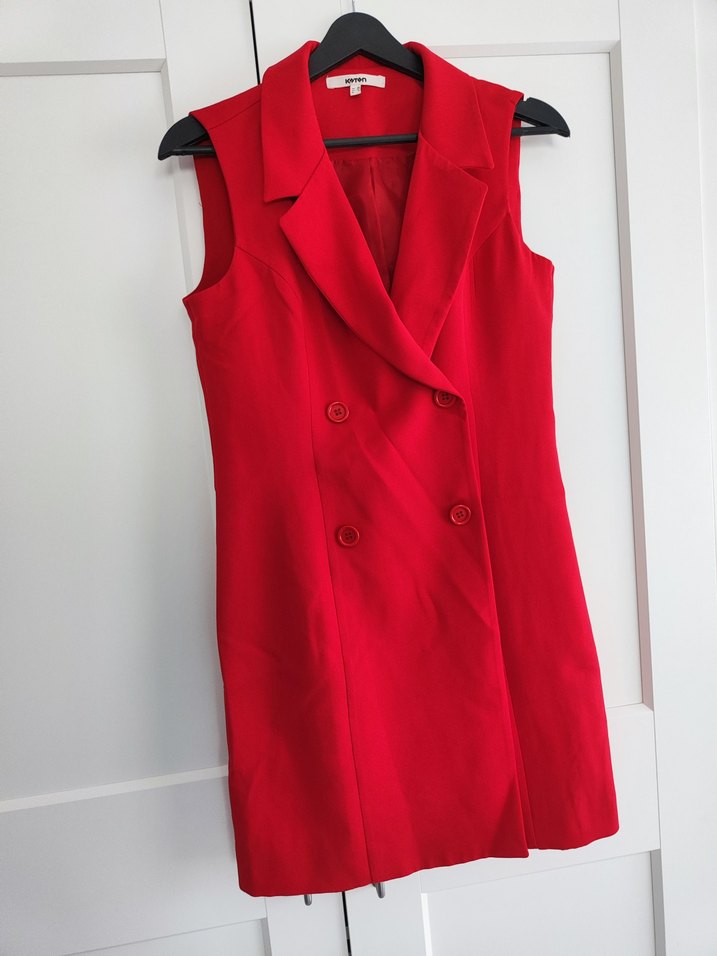 Kırmızı, düğmeli, yakalı ve kolsuz bu midi elbise, ipeksi kumaştan yapılmış, ofis için modern klasik tarzda, vücuda oturan kesime sahiptir. ✨