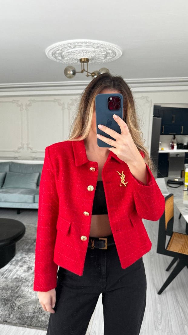 Uzun kollu, kırmızı mini blazer ceket, düğmeli ve işlemeli desene sahip. Parlak yüzeyi ve kesimiyle trend bir şıklık sunar. 2 kez giyildi. L beden ama kol boyu kısa oldugu için m bedene daha uygun olur.