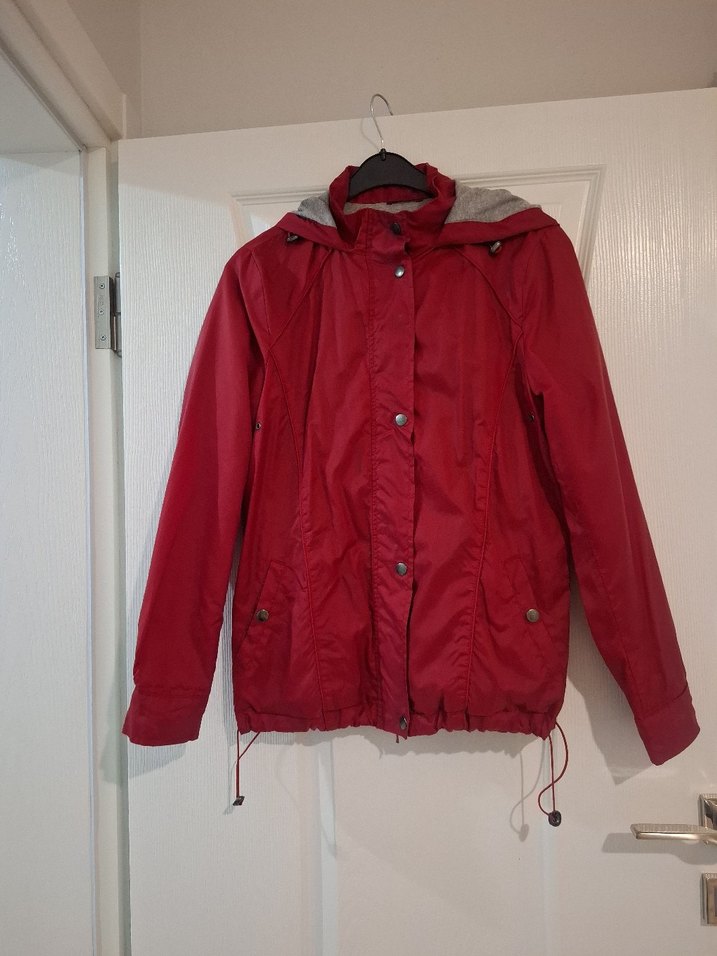 Kırmızı renkli, düğmeli, bol kesim kadın yağmurluk. Uzun kollu, gri kapüşonlu ve ayarlanabilir ip detaylı, yumuşak sentetik kumaştan outdoor kullanıma uygun.