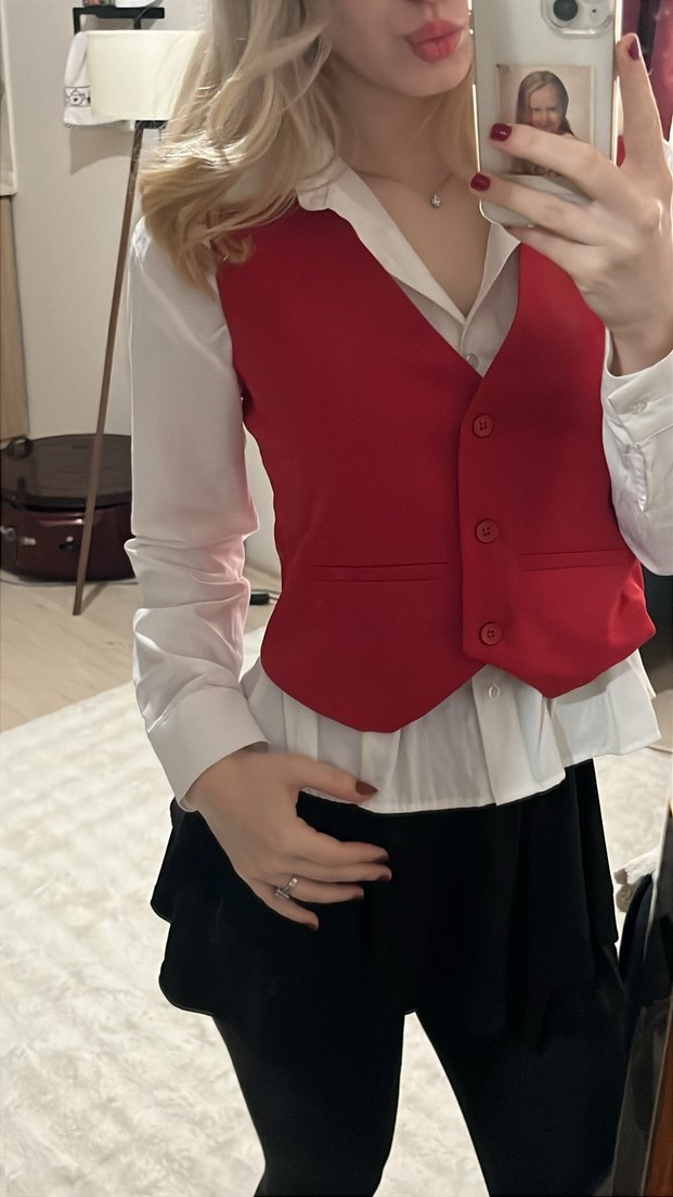 Düğmeli, V yakalı ve kırmızı renkli, ipeksi kumaştan yapılmış kadın yelek. Ofis için uygun, kolsuz ve midi boyda, cesur sokak stiliyle iş tarzını birleştirir.