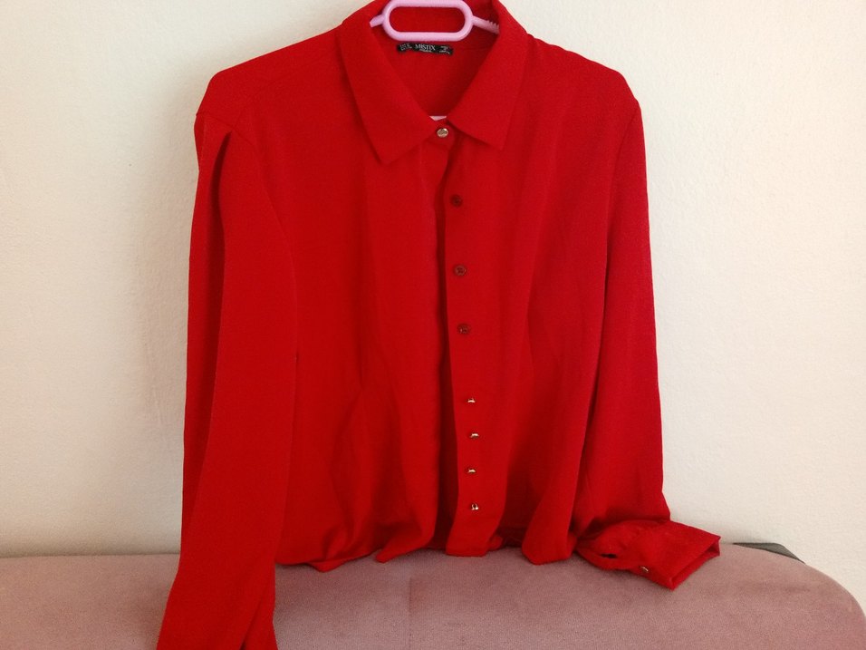 Düğmeli, yakalı ve uzun kollu kırmızı şifon gömlek. Salaş kesimi ve parlak dokusuyla ofis stiline uygun. hiç giyilmedi.yikayinca renk veriyor