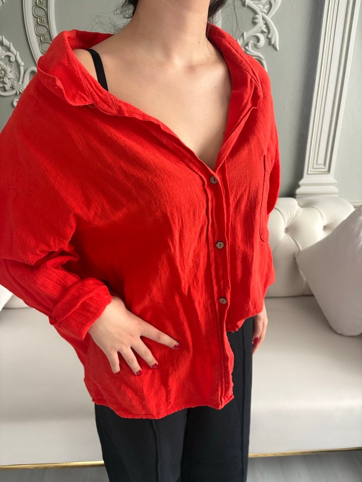 Kırmızı keten kumaştan, düğmeli ve yakalı uzun kollu, bol kesim midi uzunluğunda kadın gömlek. Günlük sokak stili için uygun.