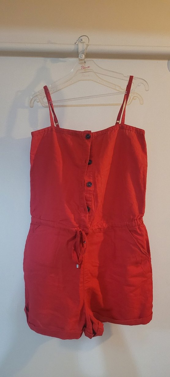 Kırmızı keten kumaştan, düğmeli, askılı, bol kesim kadın tulumu.