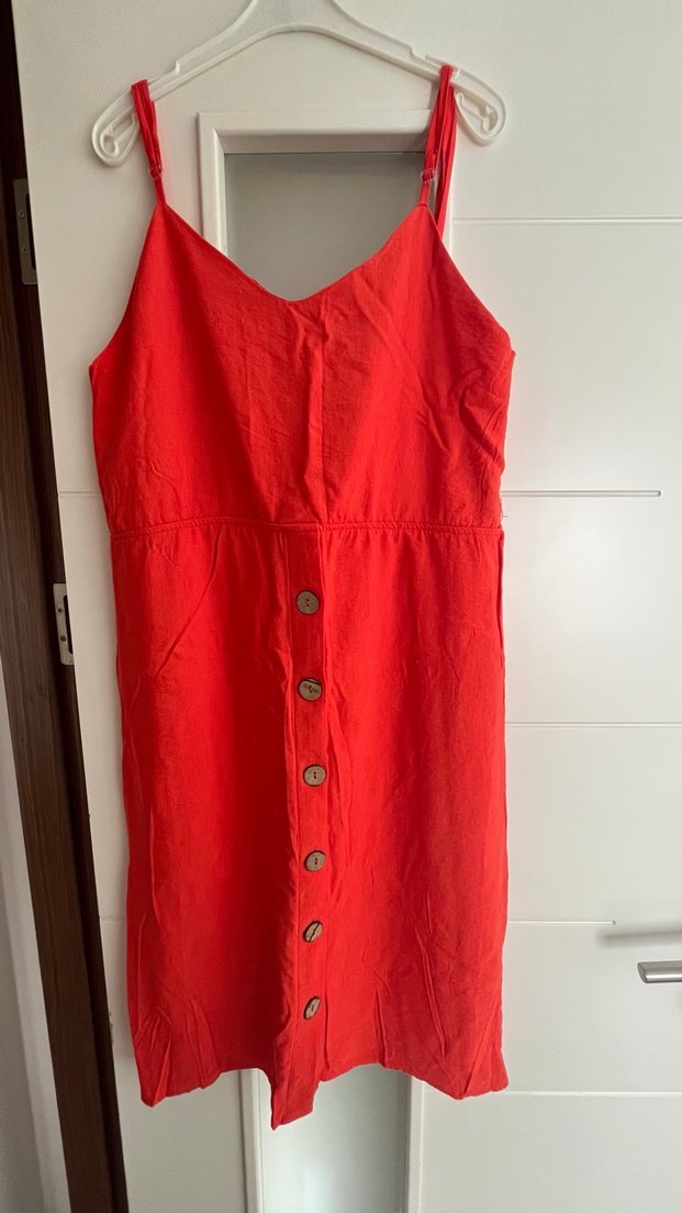 Keten kumaştan, kırmızı renkli, düğmeli ve V yakalı, kolsuz, midi boyda, ince kesimli sade bohem tarzda elbise.