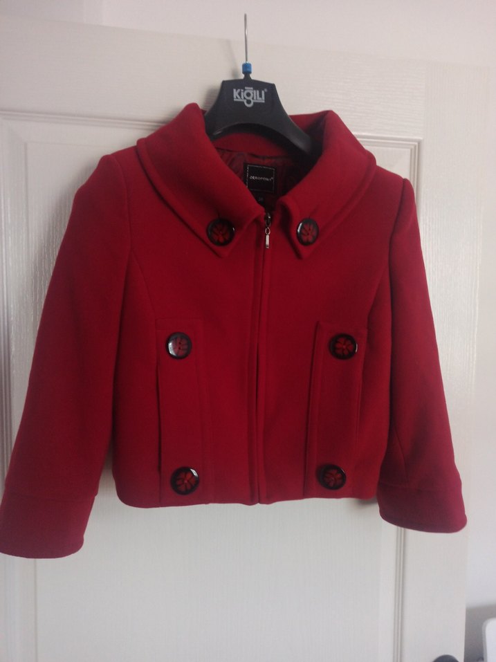 Düğmeli önü ve kesik yaka detayıyla kırmızı, kısa ve vücuda oturan kadın kabani. Uzun kollu, yumuşak ve sıcak dokulu kumaştan, ofise uygun şık bir parça.