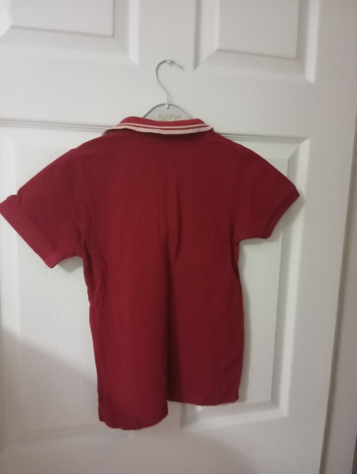 Düğmeli, yakalı ve kısa kollu, renkli sentetik kumaştan yapılmış, sportif ve sokak stiline uygun kırmızı erkek polo tişörtü.