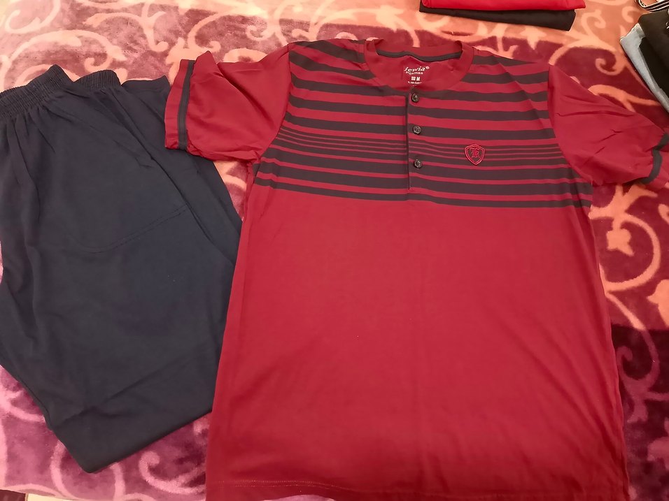 Kısa kollu, düğmeli ve yuvarlak yakalı erkek pjama takımı. Gevşek kesim, koyu kırmızı renk ve baskılı çizgilerle günlük kullanım için sentetik kumaştan üretilmiştir.