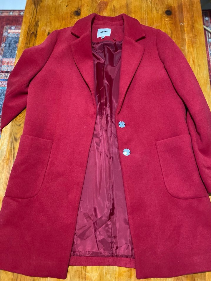 Kırmızı renkte, iki düğmeli ve büyük ceplere sahip kaban. İç kısmı yumuşak astarlı, soğuk havalar için uygun.