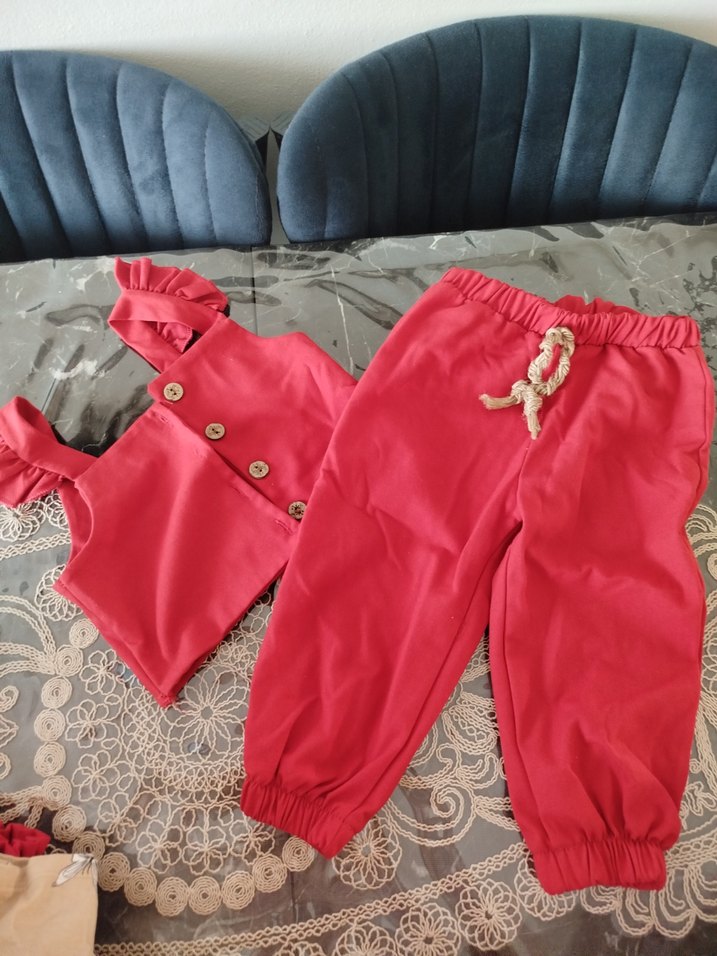 Renkli, kolsuz ve düğmeli üst ile lastikli ve bağcıklı pantolondan oluşan kırmızı bebek kız takımı. Desensiz ve rahat bir tasarım sunar.
