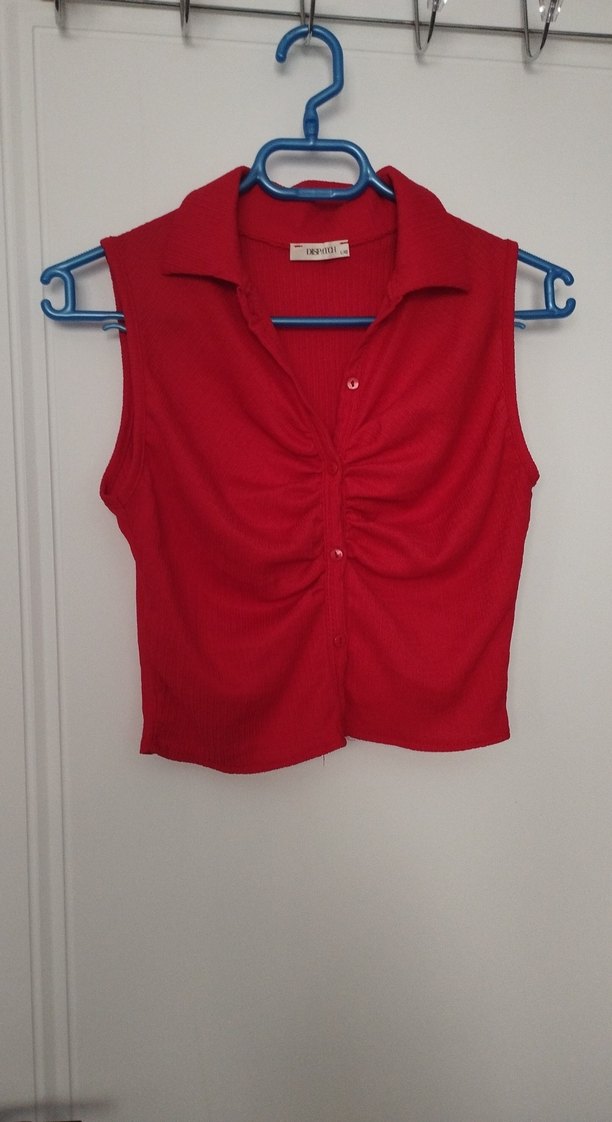 Düğmeli ve yakalı, kolsuz kırmızı mini gömlek. Sentetik kumaştan yapılmış, rahat ve renkli bir tasarım. l beden yazsada S m bedene daha uygun