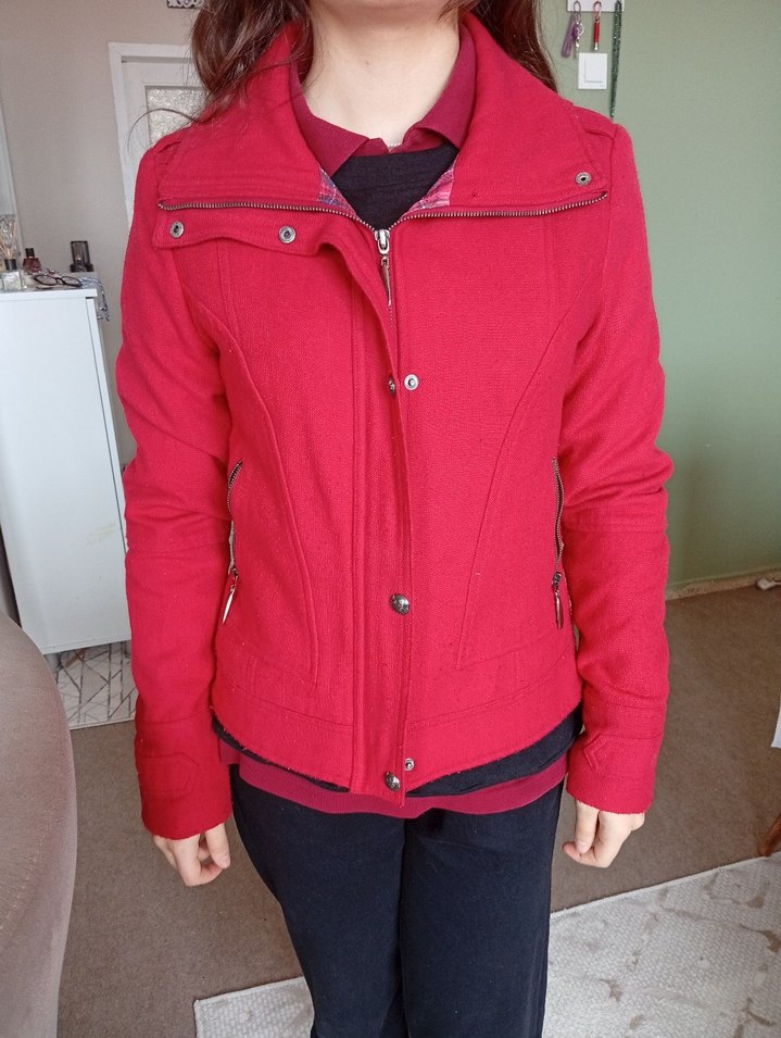 Kırmızı, düğmeli, dik yakalı, uzun kollu, normal midi uzunlukta, sıcak ve yumuşak dokulu, kadın casual ceket.