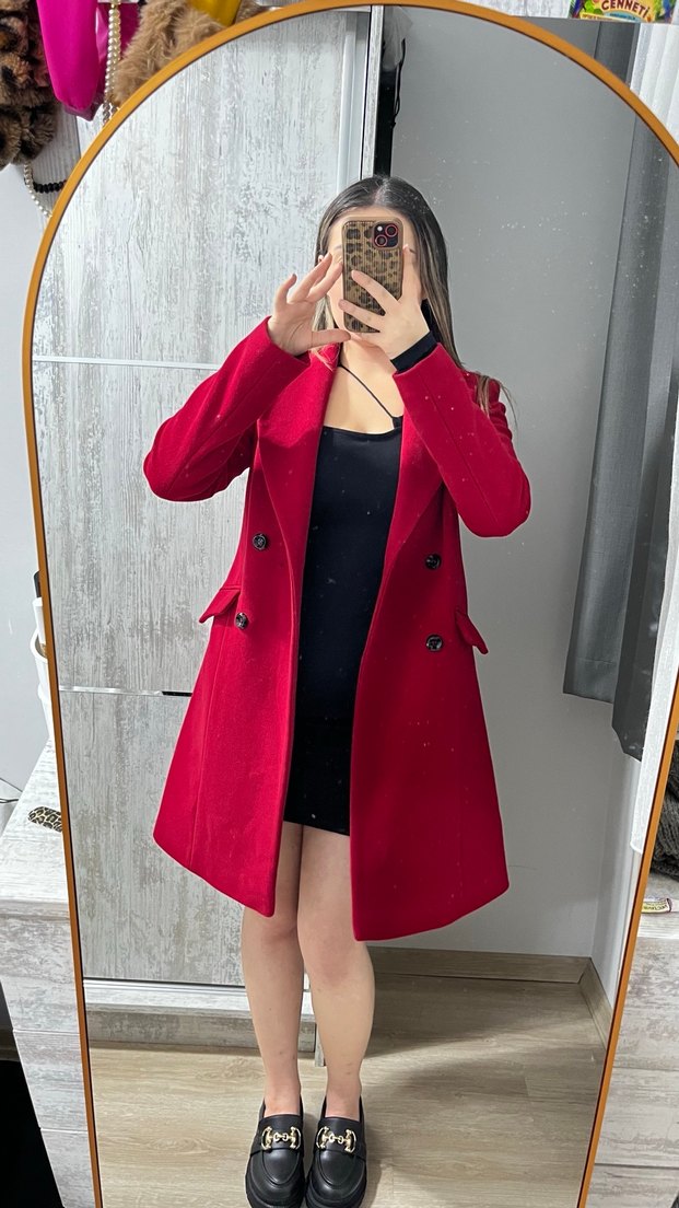 Düğmeli önü ve keskin yakasıyla kırmızı, diz boyu fitted kadın kaban. Yumuşak ve sıcak kumaştan, günlük kullanıma uygun uzun kollu kaban. M beden olmama rağmen bana bu şekilde oldu dar kalıp değil bilginize ürün temiz 1 kere giyildi .