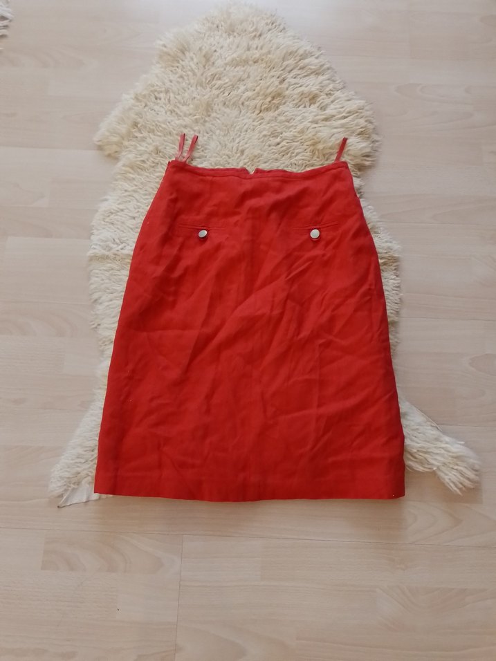 Parlak kırmızı keten kumaştan, düğme detaylı, bohem tarzda, günlük kullanıma uygun dar kesim etek
