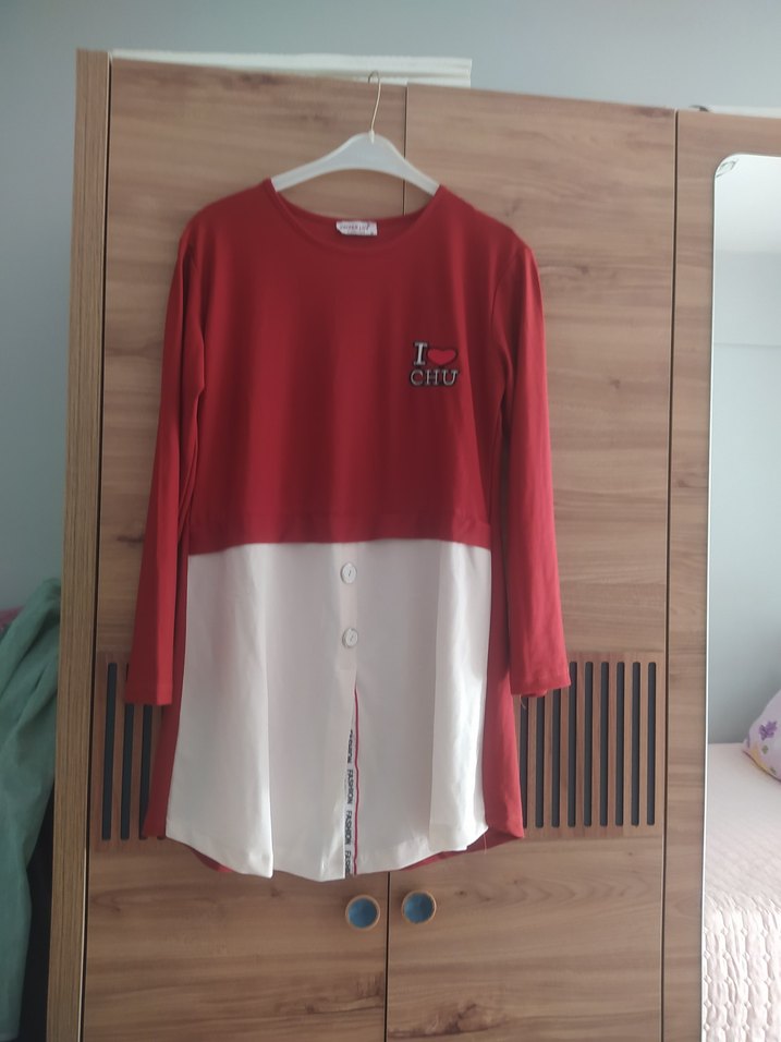 Kırmızı, düğmeli beyaz alt kısmı olan pamuklu, uzun kollu, yuvarlak yakalı, kısa ve bol kesim kadın gömleği. Günlük sokak stili için uygundur.