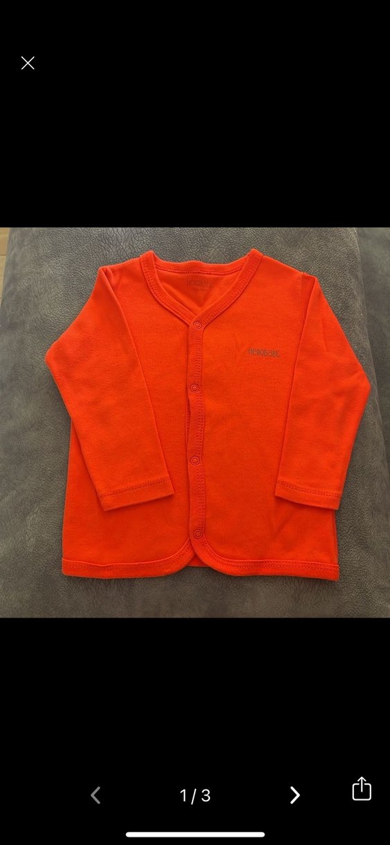 Uzun kollu, düğmeli bebek hırkası. Yumuşak ve sıcak kumaştan, bol kesim, düz ve canlı kırmızı renkte.