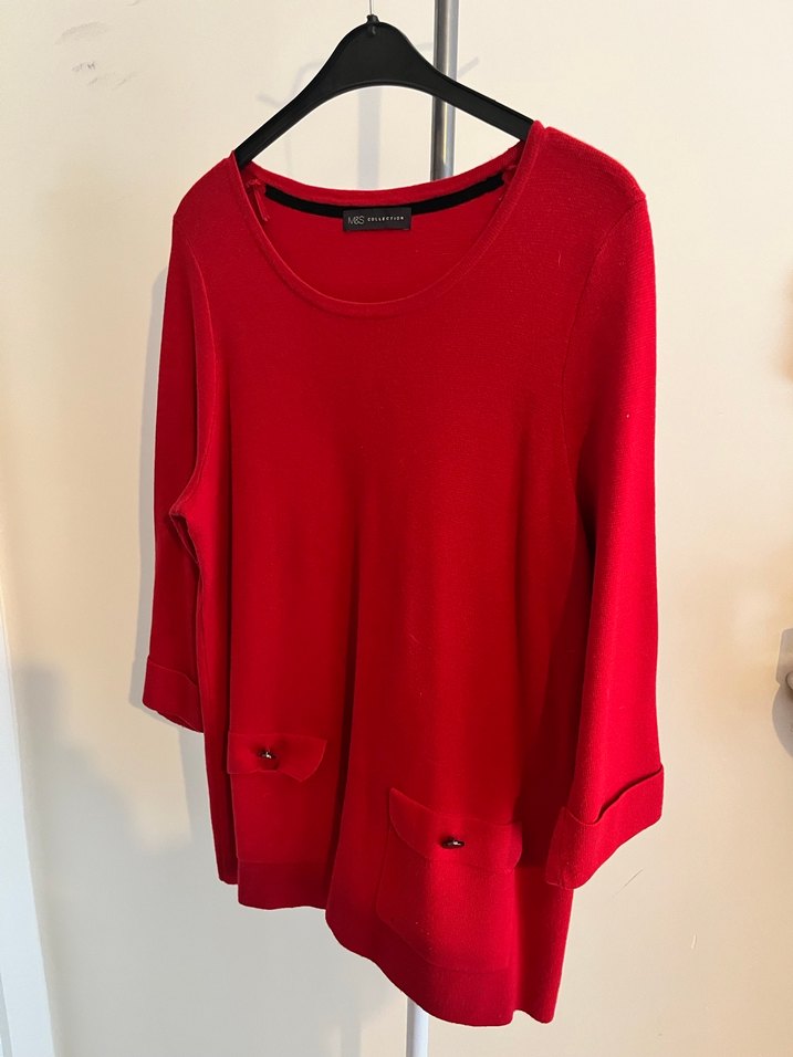 Kırmızı, uzun kollu ve düğmeli cepleri olan rahat kesim bir kadın kazağıdır. Yuvarlak yaka ve midi uzunluğundadır, yumuşak ve sıcak kumaştan üretilmiştir.