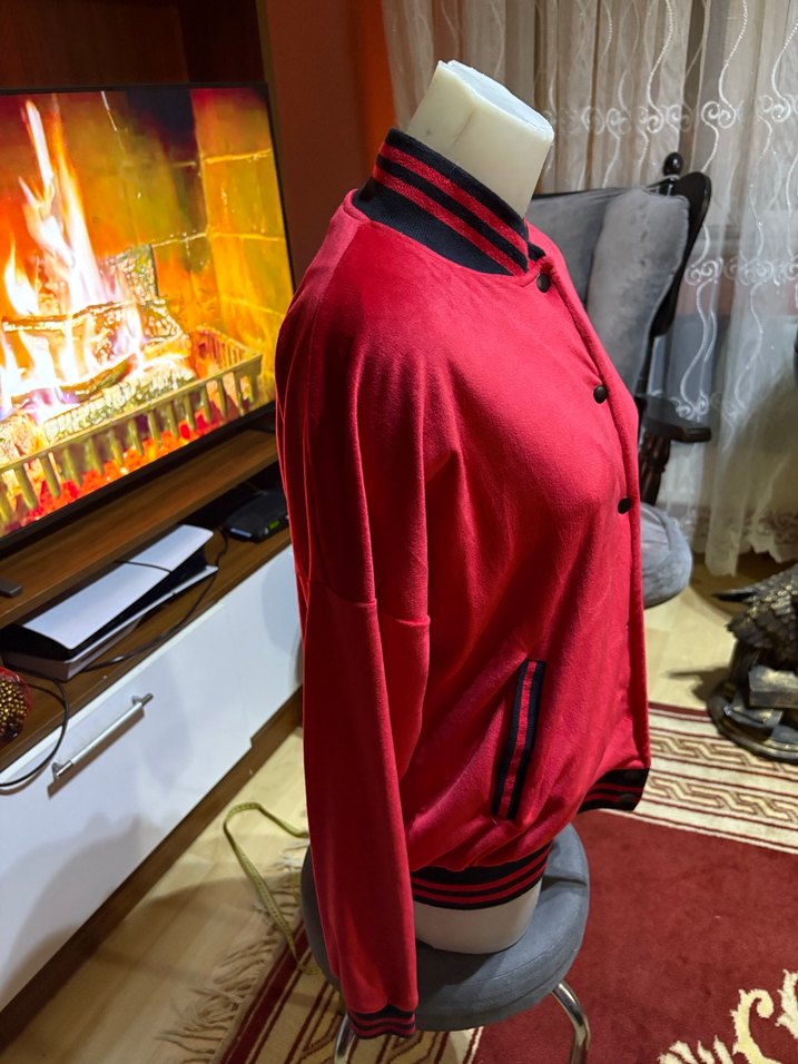 Kırmızı renkli, M düğmeli, uzun kollu, rahat kesim kadın ceket. Renkli çizgili detaylarıyla sokak stiline uygun bir parça. İki çıtçıt yok o yüzden fiyatı uygun tutucam ..Yırtık sökülme yok❌❌