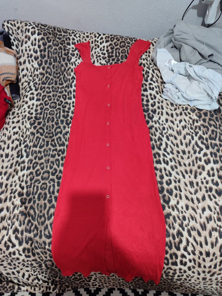 Düğmeli, straplez yaka ve kolsuz kırmızı uzun elbise. Minimalist tasarımıyla günlük sokak stiline uygun, vücuda oturan kesim.