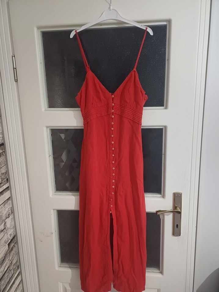 Kırmızı, ince askılı ve V yakalı bu dar kesim elbise, önden düğme detaylarına sahiptir. Uzun boyu ve yumuşak sentetik kumaşıyla romantik akşamlar için uygundur.