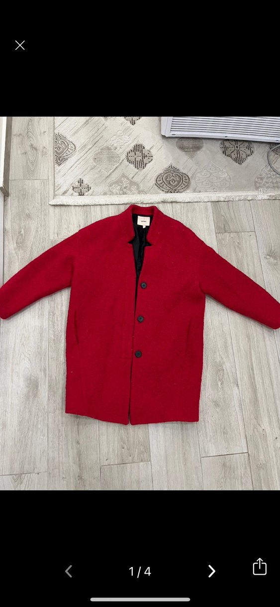 Kırmızı uzun kaban, düğmeli kapama ve siyah astar ile sade tasarıma sahiptir. Yumuşak ve sıcak kumaştan üretilmiştir.