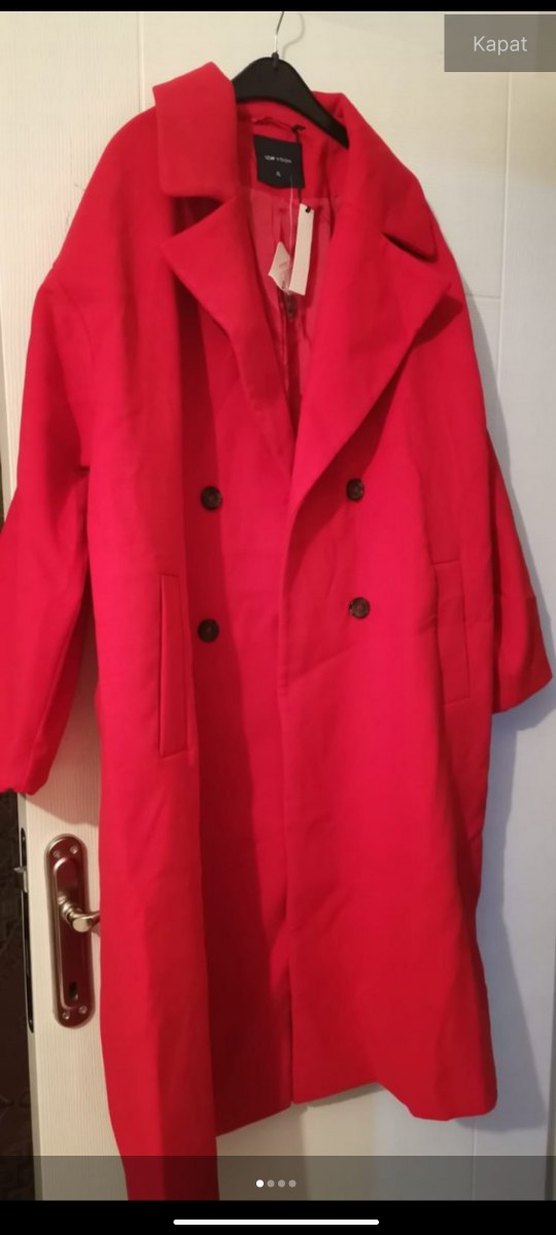 Kırmızı uzun kadın kaban, düğmeli ve kesik yakalıdır. Yumuşak ve sıcak kumaştan yapılmış, rahat kesim ve uzun kolludur.