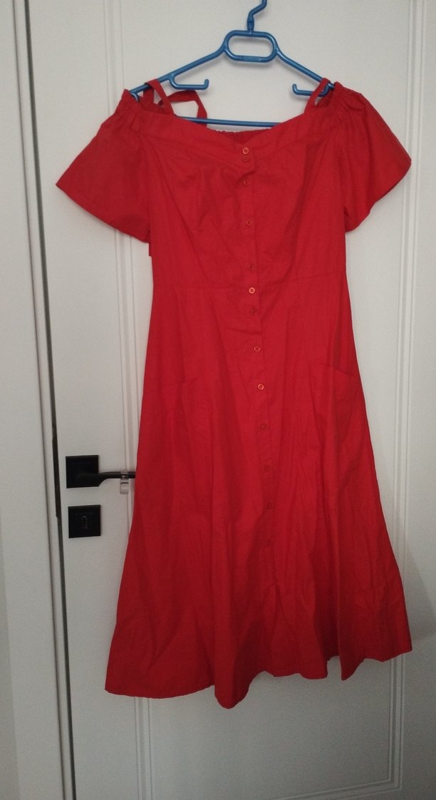 Keten kumaştan yapılmış, kısa kollu, askısız ve düğmeli uzun kırmızı elbise. Bol kesimi ve vintage bohem tarzıyla romantik akşamlar için uygundur.