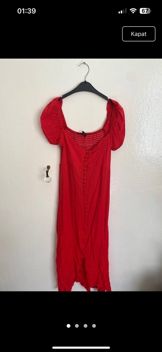 Düğmeli ön kısmı, kayık yaka ve kısa balon kollu kırmızı keten uzun elbise. Parlak kumaşı minimal bohem tarzını tamamlar. Marka temsili