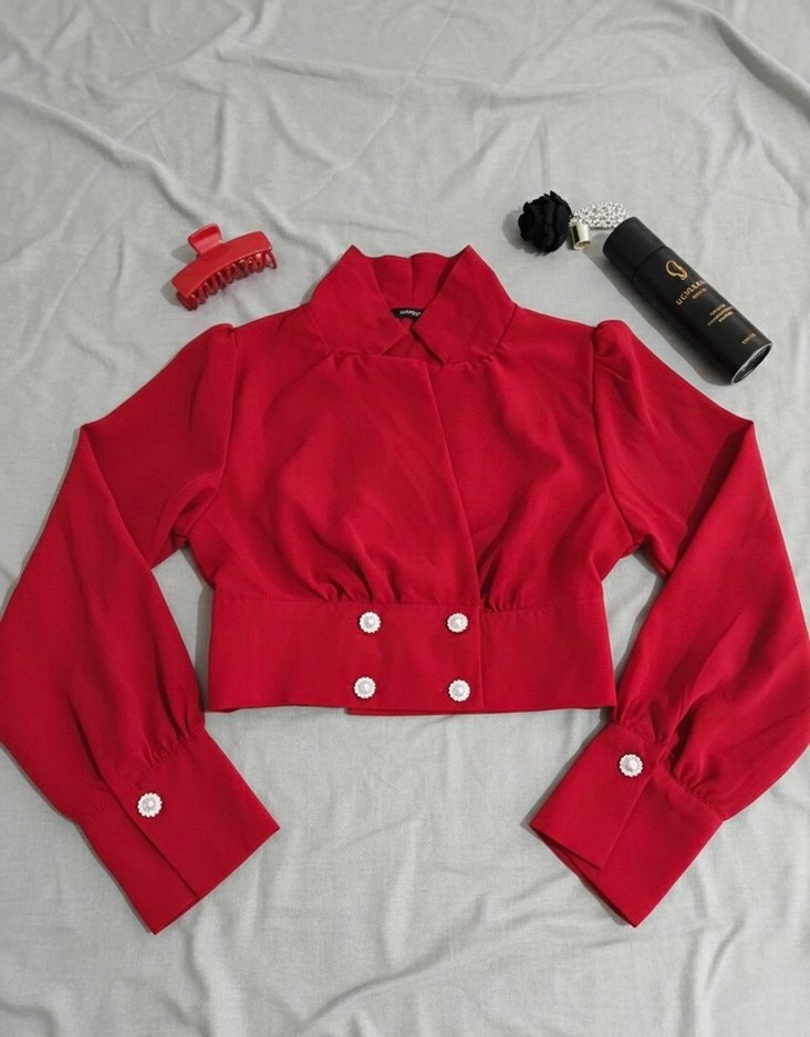 kırmızı, düğmeli ve uzun kollu olan bu bluz, notched lapel yakaya sahiptir. Yumuşak ve sıcak dokusu günlük kullanıma uygundur.