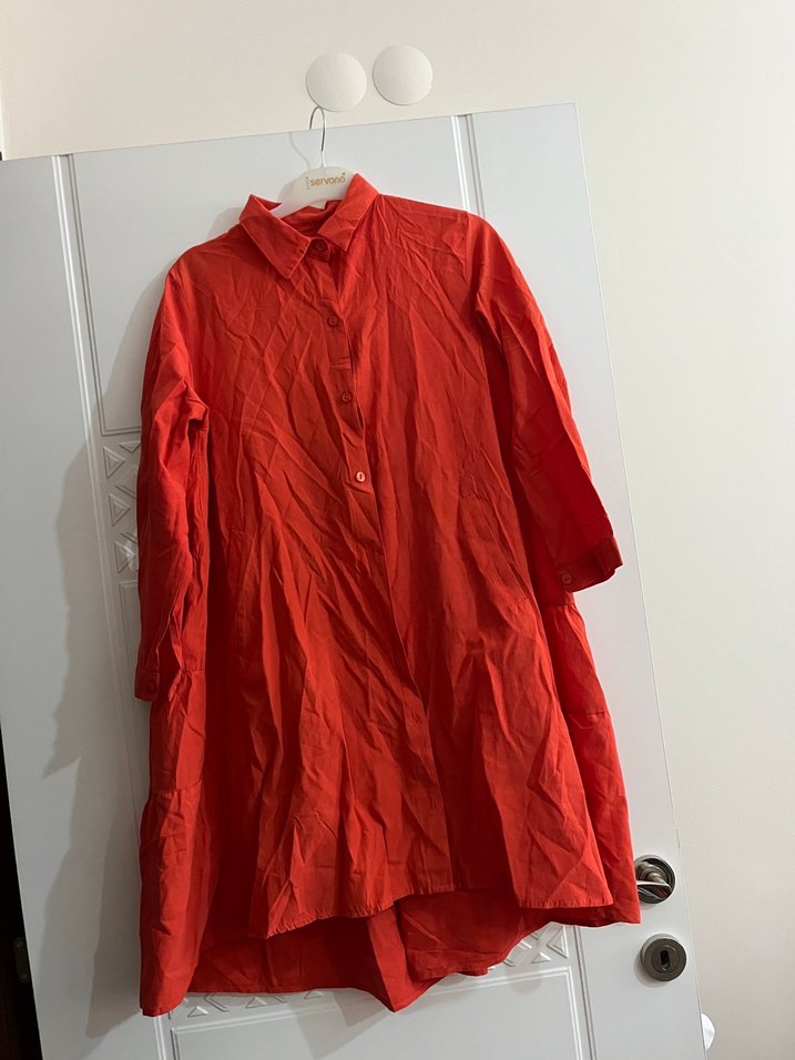 Kırmızı, bol kesim kadın gömlek, yakalı ve düğmeli ön detaylıdır. Yumuşak keten kumaştan, uzun kollu ve midi boyda, günlük kullanım için uygundur.