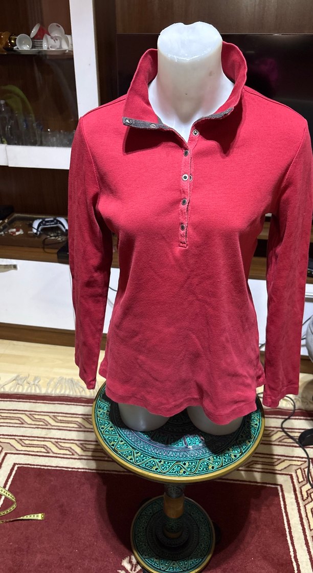 Kırmızı, düğmeli ön kısmı ve yakası olan, uzun kollu, vücuda oturan kadın tshırtYumuşak ve sıcak bir kumaştan üretilmiş, günlük rahat sokak stili için uygundur. En üstteki çıt çıt düştüğü için değerinin altında fiyatı tuttum