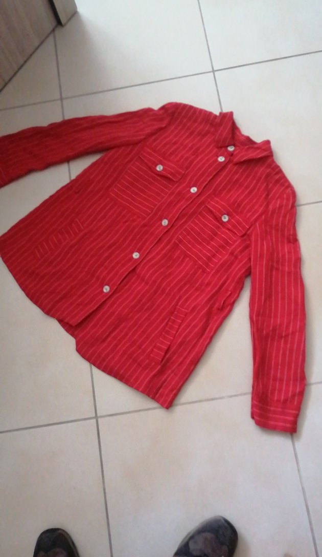 Kırmızı keten kumaştan yapılmış uzun kollu, düğmeli gömlek. Normal boyda, notched lapel yakalı ve cep detaylı, rahat kesim.