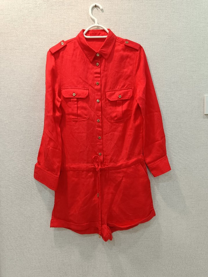 Kırmızı keten gömlek, uzun kollu, kesik yaka ve bol kesim. Düğmeli ön cepler ve belde bağcık detayı bulunur. Günlük rahat sokak stili için uygun. ürün hediye geldi hiç kullanilmadı kumaşı harika