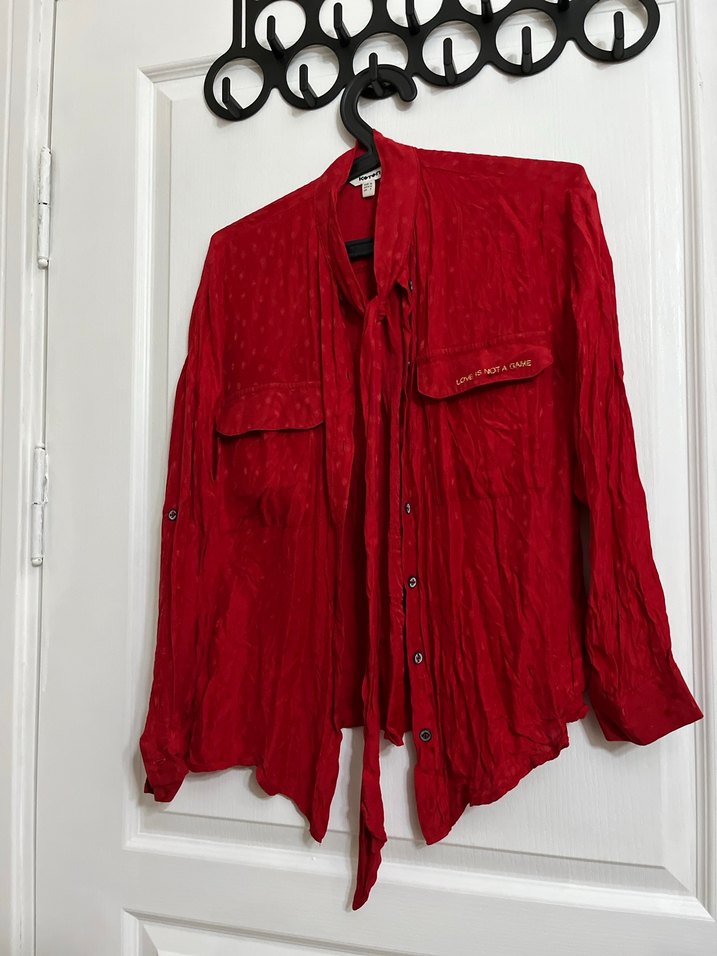 Düğmeli, uzun kollu kırmızı saten gömlek.