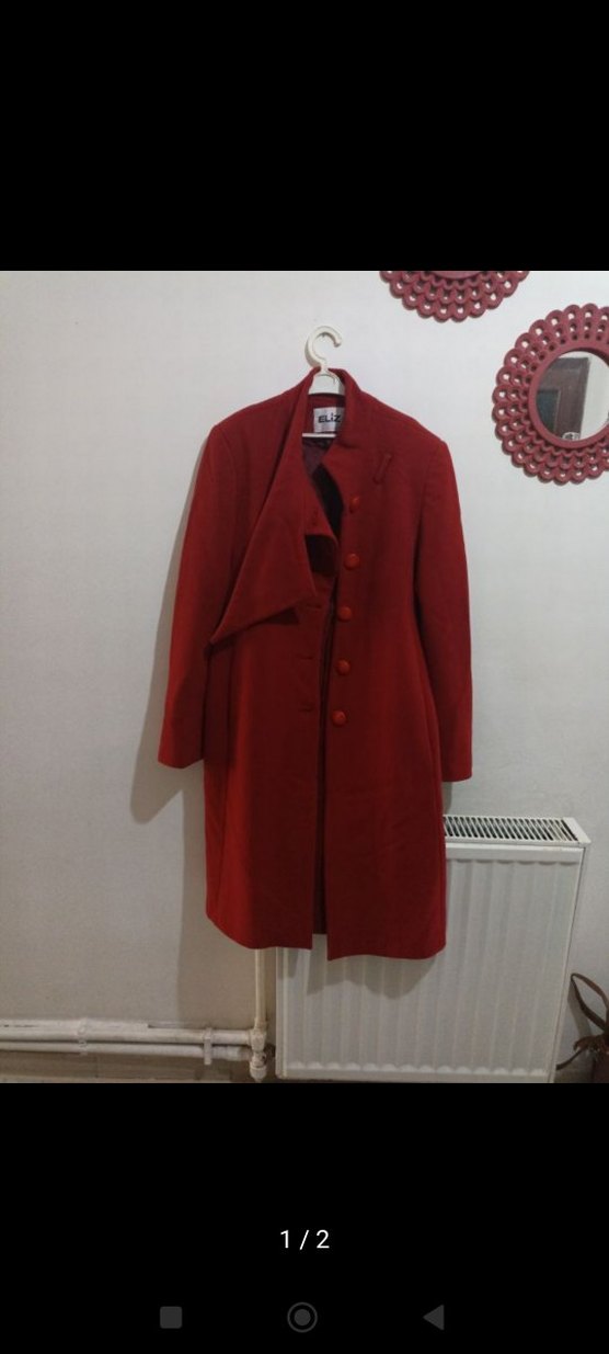 Kırmızı renkte, düğmeli uzun kaban. Klasik yaka ve şık kesimiyle dikkat çeker. Soğuk havalar için uygundur. m bedenede uyar