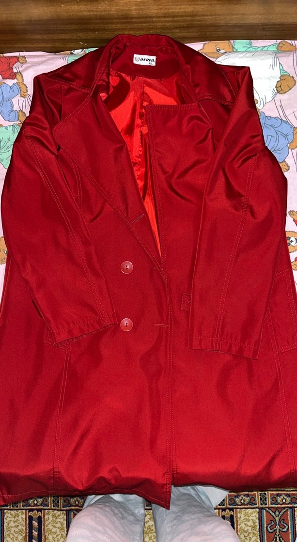 Parlak kırmızı renkte, kesik yakalı ve düğmeli uzun trençkot ofis kullanımı için uygun, regular fit ve uzun kolludur. ✨ beden xxl ancak dar kalıp alt kısmında hafif bir yırtmaç detayı mevcuttur ürün güzel bir kırmızı flaşla açık çıkmış rengi biraz