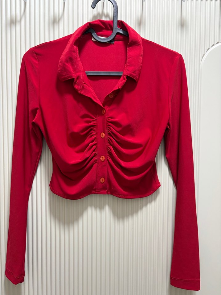 Kırmızı renginde, parlak kumaştan, düğmeli ve V yakalı, uzun kollu, normal boyda, minimal ve günlük kullanıma uygun kadın bluz