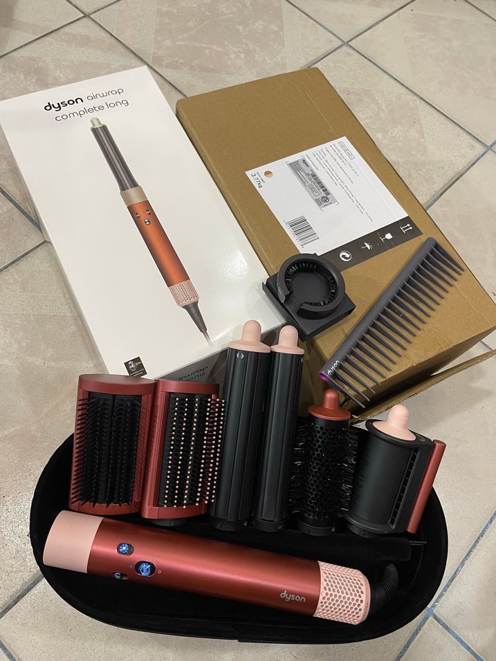 Kırmızı Dyson Complete Long saç şekillendirici, çeşitli fırçalar ve başlıklarla farklı saç stilleri yaratmanızı sağlar. Kolay kullanımlı ve şık tasarımlıdır.