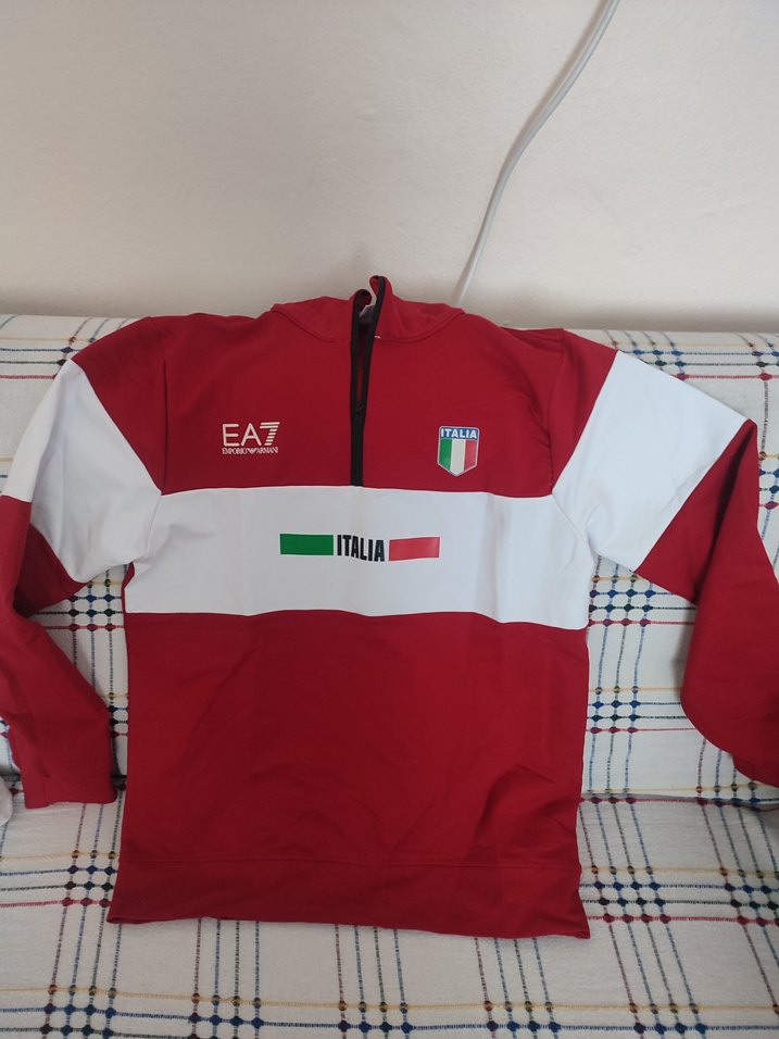 Hiç kullanmadım. Kırmızı, beyaz detaylı, uzun kollu ve fermuarlı EA7 marka sweatshirt. Yumuşak ve sıcak kumaştan, İtalya baskılı sportif tarz için uygun. %100 polyester