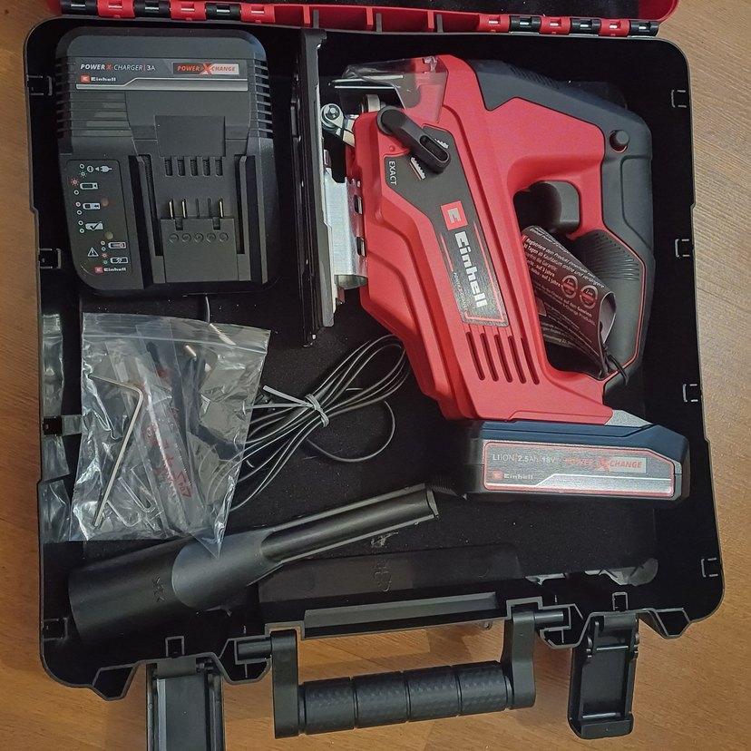 Şarjlı Einhell kırmızı dekupaj testere, şarj cihazı ve aksesuarlarıyla birlikte taşıma kutusunda. Çok yönlü kesim işleri için uygundur.