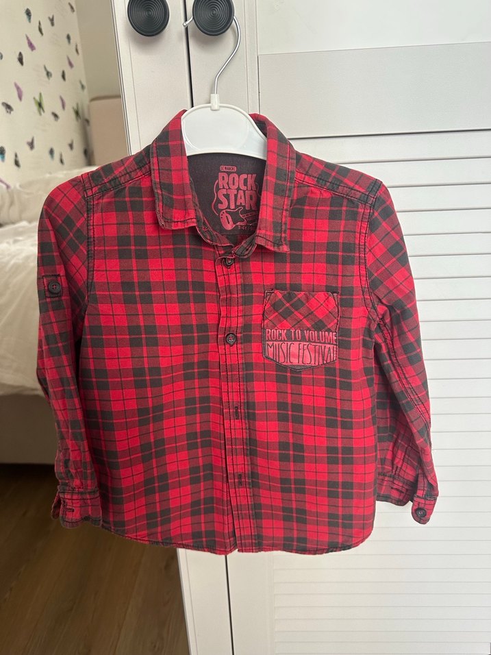 Koyu kırmızı ekose desende, düğmeli ve yakalı uzun kollu çocuk gömleği. Yumuşak ve sıcak kumaştan, regular fit kesim ve rock müzik temalı baskılı cep detayıyla. 2-3 yaş
