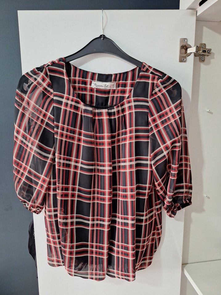 Sentetik kumaştan, kısa kollu, yuvarlak yakalı ve pileli tasarıma sahip kırmızı ekose desenli bluz.