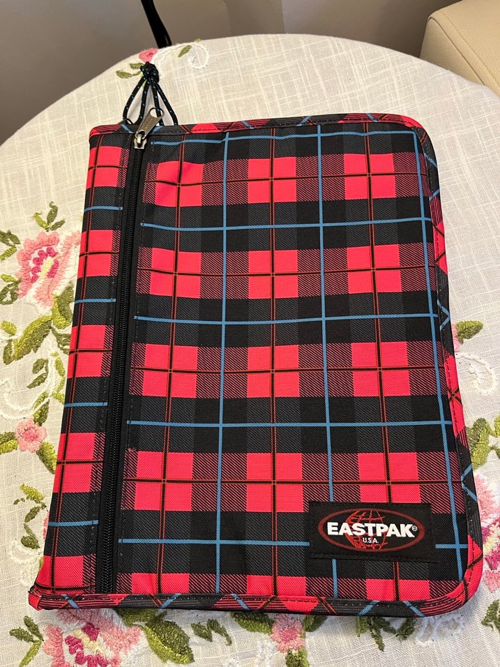 Eastpak marka, kırmızı ekose desenli, fermuarlı dosya çanta. Dersane için ideal