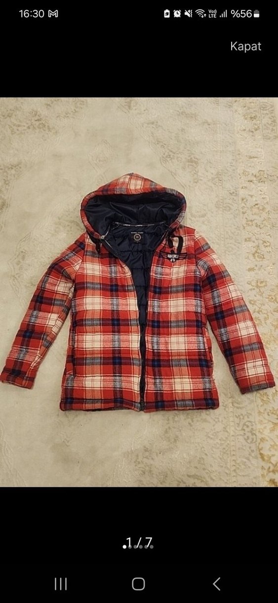 Kırmızı ekose desenli, geniş kesim erkek çocuk kaban. Kürk detaylı, kapüşonlu ve yumuşak polar kumaştan üretilmiştir.